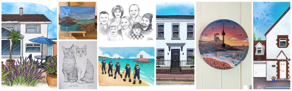 I also hadn’t really considered the incredibly varied work that would come my way! From personal commissions – house portraits, pet and family portraits, personalised Christmas cards and tide clocks – to live event drawing, window painting, sign writing, teaching aspiring artists both young and old, and illustrating a for number of projects, I could not have asked for a more diverse and interesting list of creative pursuits.