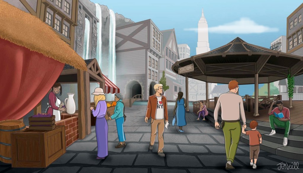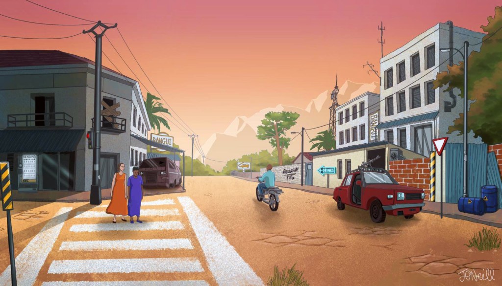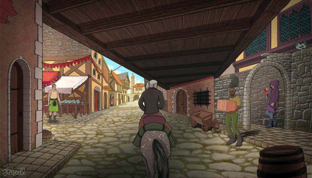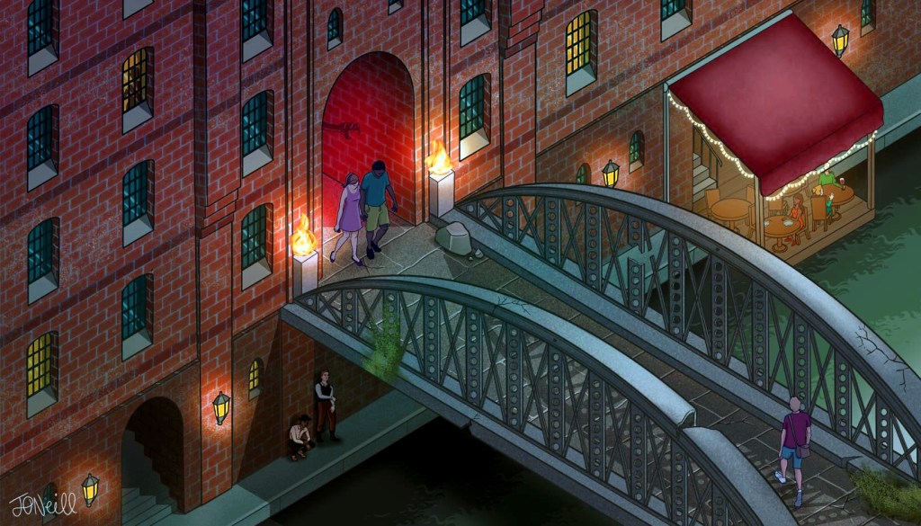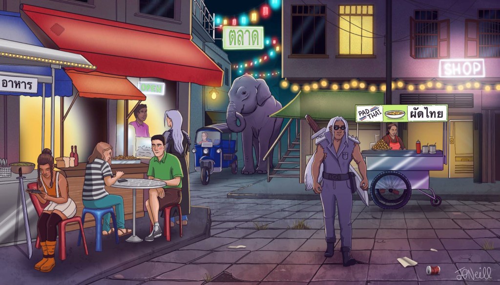 Drawing on my passion for video game concept art and my background in animation pre-production, I developed a series of vibrant digital illustrations. Each piece reflected the unique qualities of the fictional RPG environments while honouring their real-world counterparts. This involved careful research into urban life, architecture, and even the characters inhabiting these worlds.
